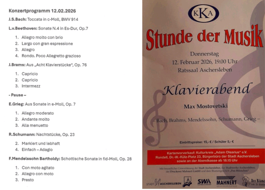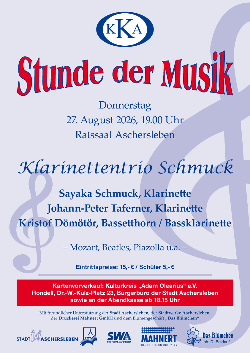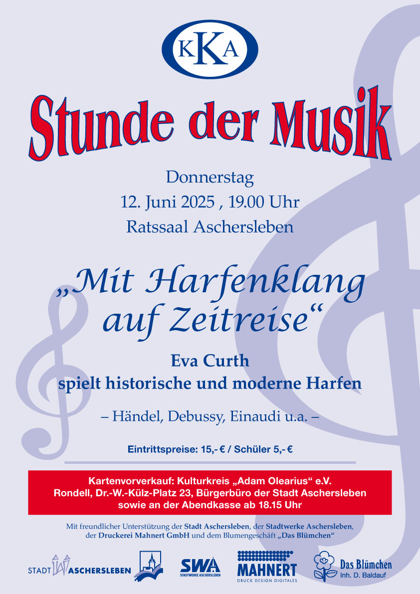 In Aschersleben erfreut sich die „Stunde der Musik“ eines guten Zuspruchs. Ein vom Konzertpublikum besonders geschätztes Qualitätsmerkmal ist das hohe künstlerische Niveau, das in einer ständig gewachsenen Wechselbeziehung zwischen dem Künstler und dem ebenso anspruchsvollen Ascherslebener Publikum als eine zuverlässige Erfolgskomponente gewertet werden darf.