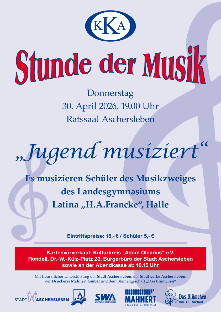 In Aschersleben erfreut sich die „Stunde der Musik“ eines guten Zuspruchs. Ein vom Konzertpublikum besonders geschätztes Qualitätsmerkmal ist das hohe künstlerische Niveau, das in einer ständig gewachsenen Wechselbeziehung zwischen dem Künstler und dem ebenso anspruchsvollen Ascherslebener Publikum als eine zuverlässige Erfolgskomponente gewertet werden darf.
